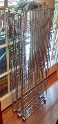 One set of five chrome wire shelves. Measures 47 1/2โ long x 17 3/4โ deep x 76โ tall. In perfect condition with all pieces and includes the wheels we added as well as the original feet you can use instead. Purchased two years ago, always used indoors, and already disassembled and ready to load.